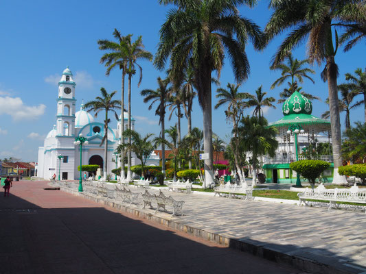 Nachdem wir nochmal herrlich direkt am Meer in der Nähe von Veracruz übernachtet haben, fahren wir weiter in die kleine Flußhafenstadt Tlacotalpan, die immerhin UNESCO-Weltkulturerbe ist. Und das nicht zu unrecht. Die Stadt steht ganz im Zeichen spanischer Kolonialarchitektur mit vielen Arkaden und wunderschönen durch Palmen begrünten Plätzen. Es gefällt uns sehr gut hier und ein Einheimischer überredet uns dazu eine Bootsfahrt auf dem Fluss zu machen. Wir bereuen es nicht, denn vom Wasseraus, hat man noch einmal einen anderen Blick auf die Stadt. Miguel erklärt uns, dass sich bei dieser Stadt zwei Flüsse treffen, deren Wasser sich erst einmal nicht vermischen. Man erkennt es an der Farbe.