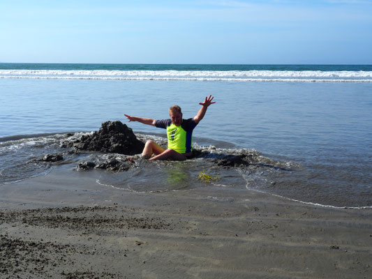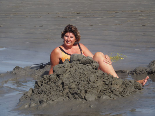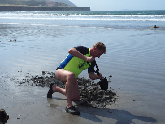 Gegen 15.00 Uhr wollen wir wieder zurück auf dem Campingplatz sein, denn der Bereich des Strandes, wo heißer Dampf aus dem Boden tritt, ist bei Flut überspült. Unser Klappspaten bekommt seinen ersten Einsatz und wir graben ein großes Loch, in dem wir beide sitzen können. Aus dem Boden tritt heißes Wasser hervor und füllt das Loch, zu unserem Leidwesen mit über 50 Grad heißem Wasser. Gut, dass unsere Nachbarn einen Eimer haben, mit dem wir kühles Meerwasser zum Beimischen holen können. Es ist ein lustiges Gefühl, von unten gekocht zu werden, während man oben im Wind etwas friert. Mit steigender Flut kommen immer mehr kalte Meerwassergüsse in unseren Hot Tub, bis es uns schließlich zu ungemütlich wird. Armin kühlt sich im Meer ab, ich gehe lieber in die Dusche, da hier sowohl das Wasser, als auch die Luft deutlich niedrigere Temperaturen haben als auf unserer ganzen bisherigen Reise.