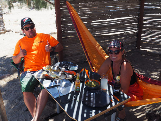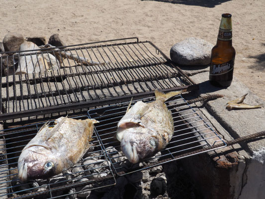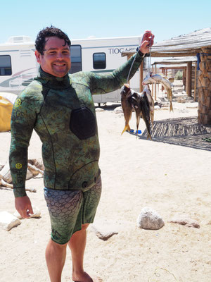 Den Tag verbringen wir mit Spaziergängen am Strand und lesen. Neben uns steht Max aus Kalifornien. Er ist leidenschaftlicher Taucher und Angler und geht vormittags raus zum Speerfischen. Zwei Stunden später kommt er mit vier Snappern zurück und lädt uns ein zu Mittag mit ihm Fischtacos zu essen. Ich mache eine Guacamole dazu und nachdem er die Fische fachmännisch ausgenommen hat, grillen wir sie. Es schmeckt ganz hervorragend. Max ist unterwegs mit Oscar, seinem Hund der gerne schwimmt, Frisbee spielt und in der Hängematte liegt. Es ist interessant sich mit ihm über alles Mögliche zu unterhalten und er gibt uns viele gute Tipps, wo wir in Kalifornien günstig übernachten können.