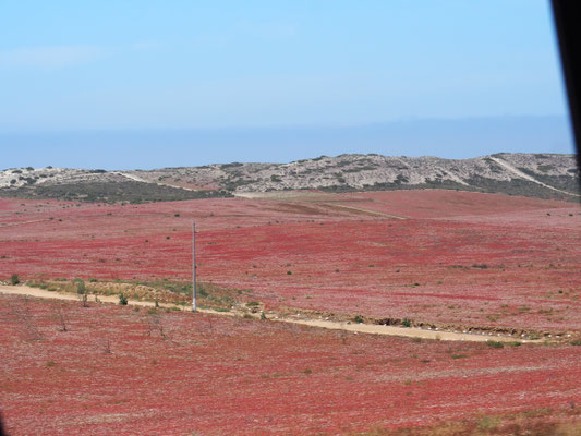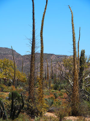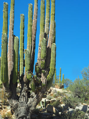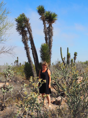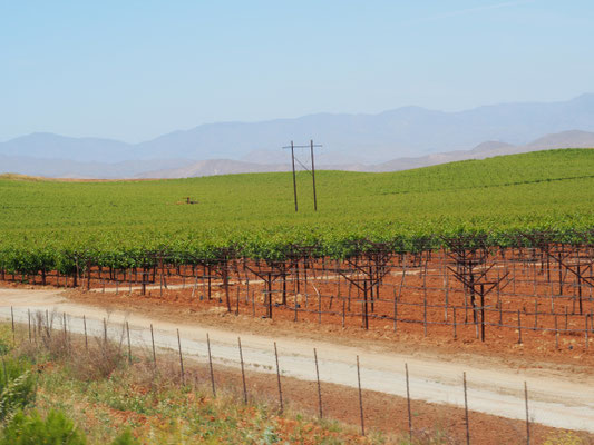 Zurück geht es über dieselbe Straße, bevor wir wieder auf die Carretera #1 stoßen und weiter Richtung Norden fahren. Wir kurven über einige Bergrücken auf einer Achterbahnstrecke, durch das Valle de Cirios, dem Valley of Candles, vorbei an Unmengen verschiedener Kakteen, die hier zum Teil leuchtend gelb und lila blühen, erspähen kurz den Pazifik, bevor es durch ziemlich hässliche Straßenstädte geht. Das ist nicht das Mexiko, das wir lieben. Doch bald ändert sich die Landschaft wieder und wir fahren durch landwirtschaftlich genutzte Flächen und Weinanbaugebiete.