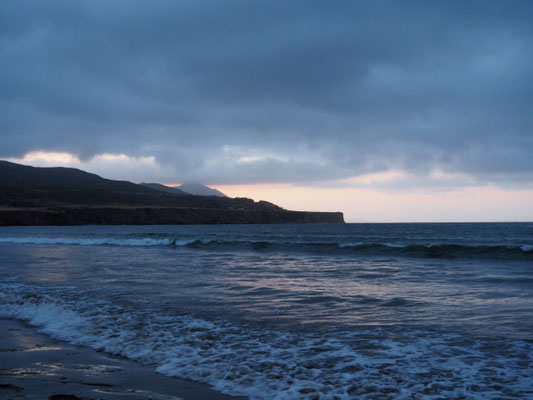 Als wir in der Früh, nach einem herrlichen Sonnenaufgang (Zeitumstellung), in ein wunderschön glattes Meer schwimmen gehen, sind wir sehr erstaunt, wie kalt hier das Wasser ist. Das sind wir nicht mehr gewöhnt und so wird es nur ein kurzes Bad. Uns gefällt es recht gut hier und nach einigem Überlegen beschließen wir noch eine weitere Nacht zu bleiben.
