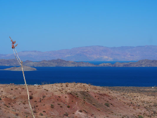 Nach weiteren hundert Kilometern durch Kakteenwüste biegen wir nach Osten ab um zur angeblich sehr schönen Bahia de los Angeles am Golf von Kalifornien zu kommen. Die Landschaft wird immer wüstenartiger, d.h. es wächst nur noch sehr wenig. Wir bewundern viele von den „Chacha Bings Kakteen“ (wir haben die Kakteen so getauft, weil sie uns an den Charakter aus Star Wars erinnern), bevor wir von einem Hügelrücken das dunkelblaue Meer vor uns sehen. Die große Bucht ist eingerahmt von einigen Inseln, frei von jeglicher Vegetation. So etwas haben wir noch nicht gesehen: ein surreales Bild aus kahlen Felsen und azurblauem Wasser. Es ist sehr einsam und menschenleer hier und hat doch einen ganz eigenen Reiz. Wir finden einen sehr schönen Campingplatz, an dem jeder Stellplatz eine eigene Palapa und einen herrlichen Blick aufs Meer hat.