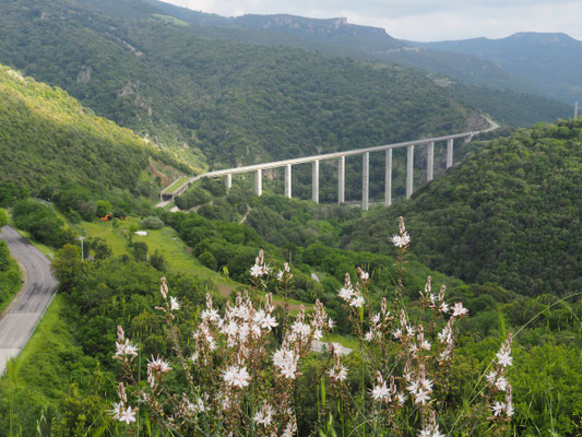 Nach Aritzo, unserem heutigen Ziel, sind es noch 40 Kilometer. Doch die Entfernung zählt hier nicht wirklich. In vielen Serpentinen fahren wir hinab bis zur Schlucht des Rio Flumendosa und auf der anderen Seite in genauso vielen Serpentinen wieder hinauf. Es ist eine extrem kurvenreiche Strecke durch die Barbagia-Berge und wir sind froh, dass wir beschlossen haben in den Bergen zu übernachten. Dazu haben wir uns ein wunderschönes Hotel "Sa Muvara" ausgesucht, auf dessen Parkplatz wir im Grünen stehen dürfen. Dieses Hotel gilt als eines der schönsten Hotels im Inselinneren und es hat ein hervorragendes Restaurant, welches sardische Spezialitäten serviert. Um uns zu revanchieren, dass wir so schön umsonst stehen dürfen, beschließen wir uns das sardische Vier-Gänge-Menü zu gönnen. Wir müssen bis 20.00 Uhr warten, denn die Sarden essen recht spät zu Abend. Das Essen beginnt mit den leckeren sardischen Vorspeisen, Käse und Schinken und dem Pergamentpapier-dünnen Brot pane carasau. Anschließend gibt es drei verschiedenen Pasta und dann porchetto auf sardische Art mit Erbsen und danach kam noch das Limonensorbet, für das Aritzo berühmt ist, da die Stadt im 19. Jahrhundert lange Eis bis aufs italienische Festland geliefert hat. Die Einwohner haben im Winter den Schnee in kreisrunden Hütten, sogenannten Schneehäusern, gesammelt, gepresst und mit Farn, Stroh und Erde bedeckt. Diese so entstandenen Eisblöcke wurden überall hin geliefert.