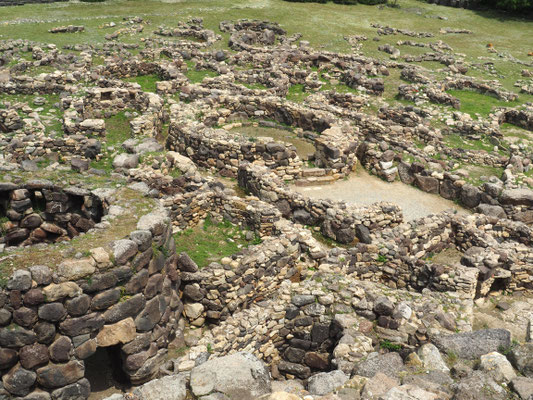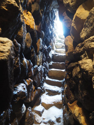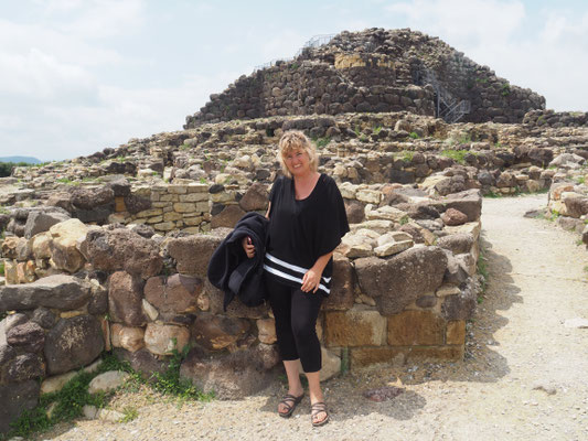 Su Nuraxi sieht von der Ferne aus wie ein höherer Steinhaufen und wir sind erstaunt, dass wir dafür 12 Euro pro Person an Eintritt zahlen sollen. Man darf die archäologische Stätte nämlich nur mit einer Führung besuchen. Unsere Führerin kann zwar Englisch, nur leider versteht man sie mit ihrer italienischen Aussprache fast nicht. Doch bald sind wir von der Nuraghe selbst überwältigt. Der "Steinhaufen" entpuppt sich als Burganlage, die ehemals eine gewaltige Wehrburg mit Verteidigungsanlagen und Dorf bildete. In die Burganlage kann man hineinsteigen und wir sind tief beeindruckt von den verschiedenen Türmen, die aus großen Basaltblöcken konisch erbaut worden sind. Wir klettern durch sehr schmal gemauerte Gänge in die Türme hinunter und dürfen uns alles genau anschauen. Es ist sehr interessant Einblick in diese Kultur zu erhalten, von der wir vorher noch nie etwas gehört haben.
