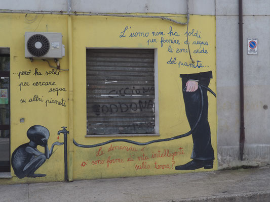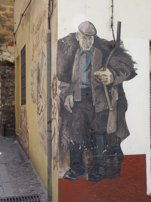 Danach passieren wir den Ort Mamoiada und erreichen schließlich Orgosolo, die einstige Banditenhochburg des Gennargentu-Gebirges. Heute zeichnet sich der Ort dadurch aus, dass die Bewohner an den Wänden der Häuser sehr viele Wandgemälde, sogenannte Murales, angebracht haben. Wir durchwandern den Ort und fotografieren die Bilder, die uns gefallen. Sie sind alle sehr unterschiedlich und wir sind recht beeindruckt.