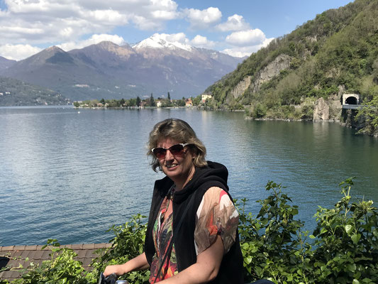 Den Nachmittag verbringen wir gemütlich am Seeufer und gegen 17.00 rufe ich Judith an, wann sie kommen. Da sie lange im Stau standen, wollen sie direkt nach Luino zum Immobilienmakler fahren. Wir wollen unser Auto nicht mehr bewegen, so schwingen wir uns auf die Fahrräder und radeln die fünf Kilometer nach Luino. Dort treffen wir Judith, Arnold und den Makler und der nimmt uns mit zu dem Villagio Olandese. Dies ist ein riesiges Areal, in dem 250 Häuschen stehen, von denen einige günstig zum Verkauf stehen. Die Häuser sind ganz nett, aber teilweise zu nah aufeinander und teilweise zu teuer. Das kommt also nicht in Frage.