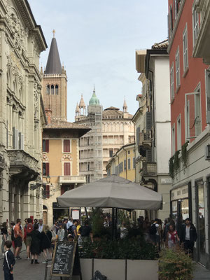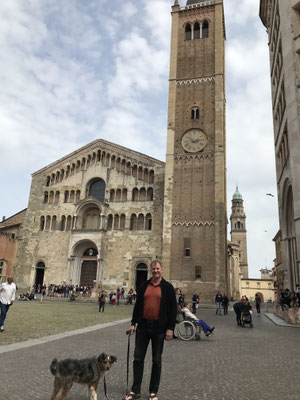 Unser nächstes Ziel ist Parma. Parma ist eine Universitätsstadt mit ungefähr 200.000 Einwohnern. Wir bekommen einen Parkplatz neben dem herzoglichen Park. Von dort ist es nicht weit in die Altstadt. Wir durchqueren den Palazzo della Pilotta der Familie Farnese und bummeln durch die kleinen Gassen. In einer Trattoria essen wir den berühmten Parmaschinken. Wir bewundern im Dom die wunderschönen Fresken von Correggio und neben dem Dom das Babtisterium. Von außen sehen wir noch das bekannte Teatro Farnese, in dem es aber heute leider keine Aufführung gibt.