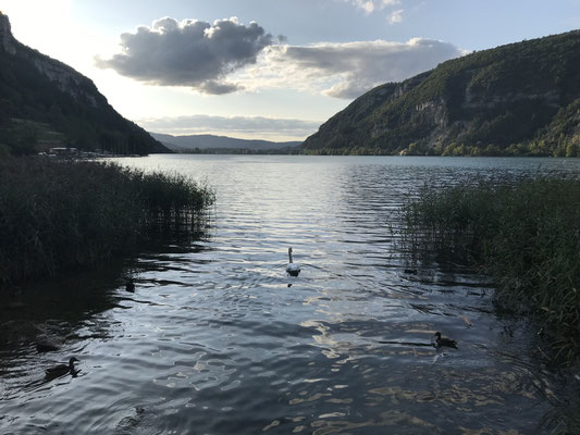 An Maria Himmelfahrt starten wir und fahren über Bregenz und die Schweiz bis kurz hinter die französische Grenze nach Nantua, 45 Kilometer westlich von Genf (Luftlinie). Dieses kleine Städtchen im französischen Juragebirge liegt direkt an dem wunderschönen See, Lac de Nantua. Wir finden einen kleinen Campingplatz mit einem sehr netten Besitzer und wunderschönen, ruhigen Stellplätzen. Die Gegend ist hier sehr schön, der See umrahmt von den Bergen, die wie eine riesige Schlucht wirken. Nach der langen Fahrt spazieren wir noch am See entlang und wundern uns, dass überall Badeverbotsschilder stehen. Wir wissen nicht warum.